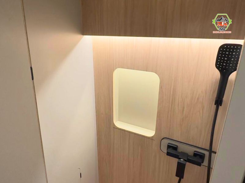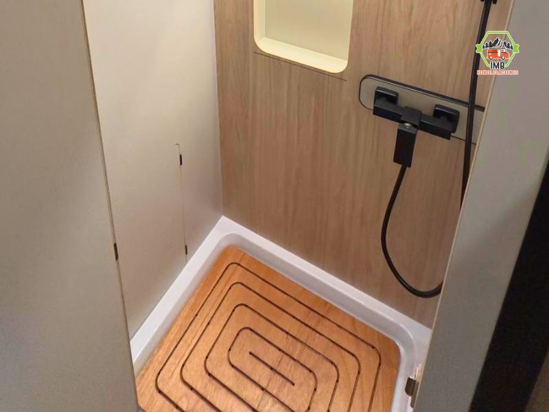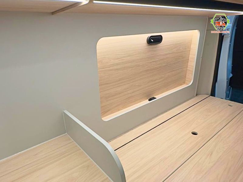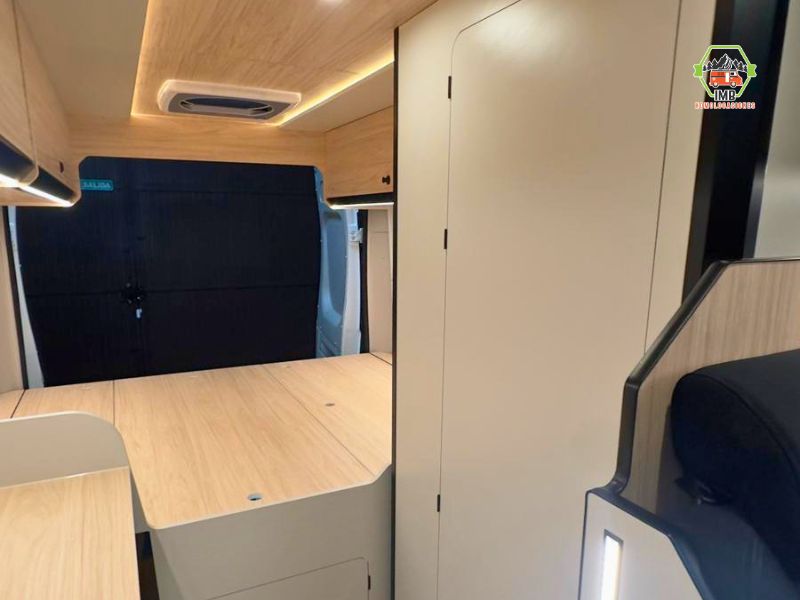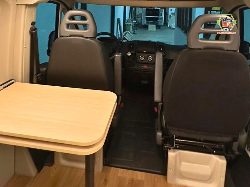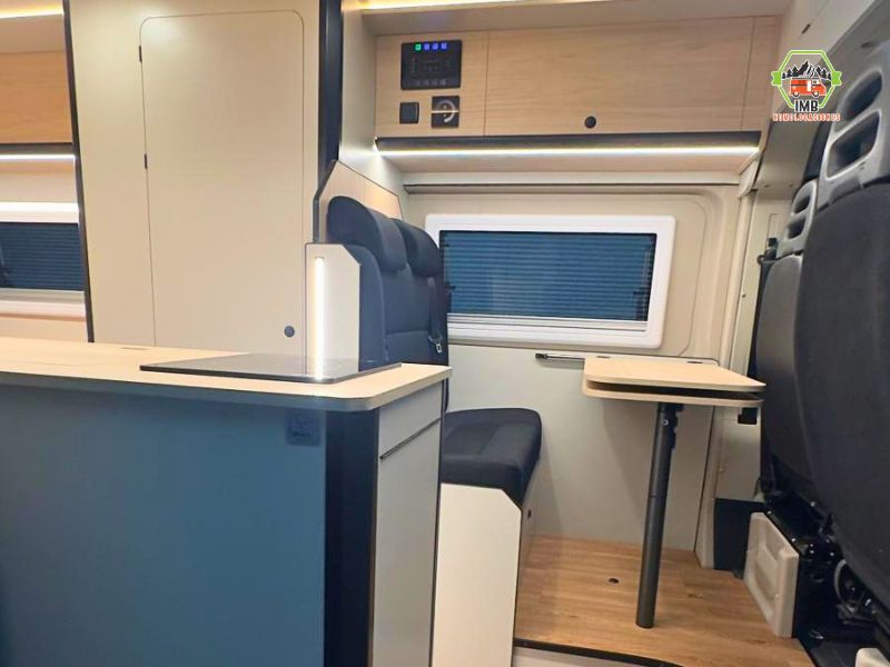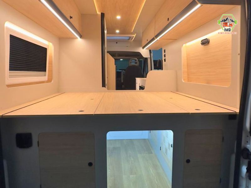 Se ha instalado una estructura de segunda fila de asientos integrada en el conjunto del mobiliario, junto con un módulo de baño con plato de ducha y tomas de agua. En la parte trasera, dispone de cama fija con espacio de almacenamiento inferior y distribución optimizada para aprovechar al máximo el espacio interior.