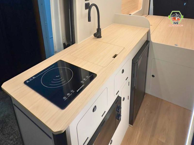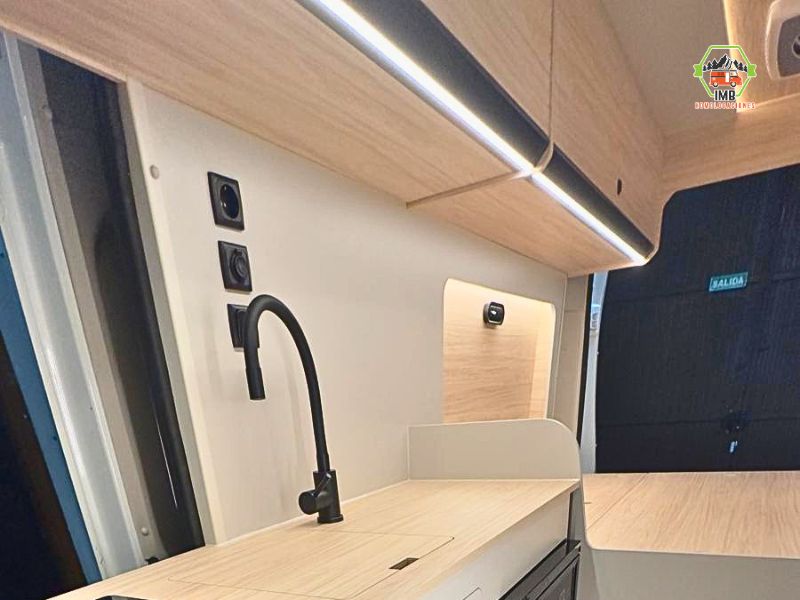 Camperización completa con aislamiento en KAIFLEX, panelado interior y mobiliario a medida en contrachapado. El vehículo cuenta con zona de cocina equipada con fregadero, vitrocerámica, microondas y nevera, además de varios altillos superiores para almacenaje.