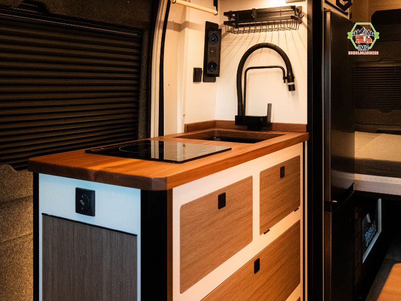 Aislamiento integral del habitáculo con KAIFLEX y revestimientos interiores, junto con la instalación de mobiliario fijo a medida que configura una distribución completa tipo vivienda.