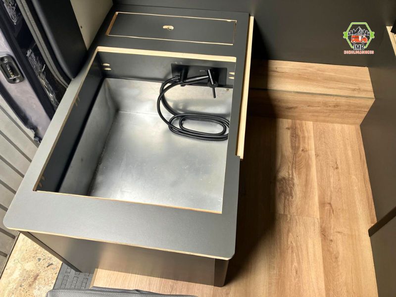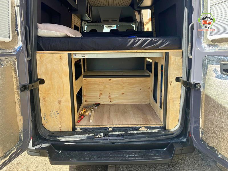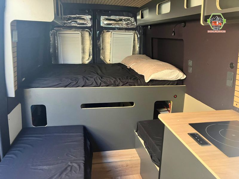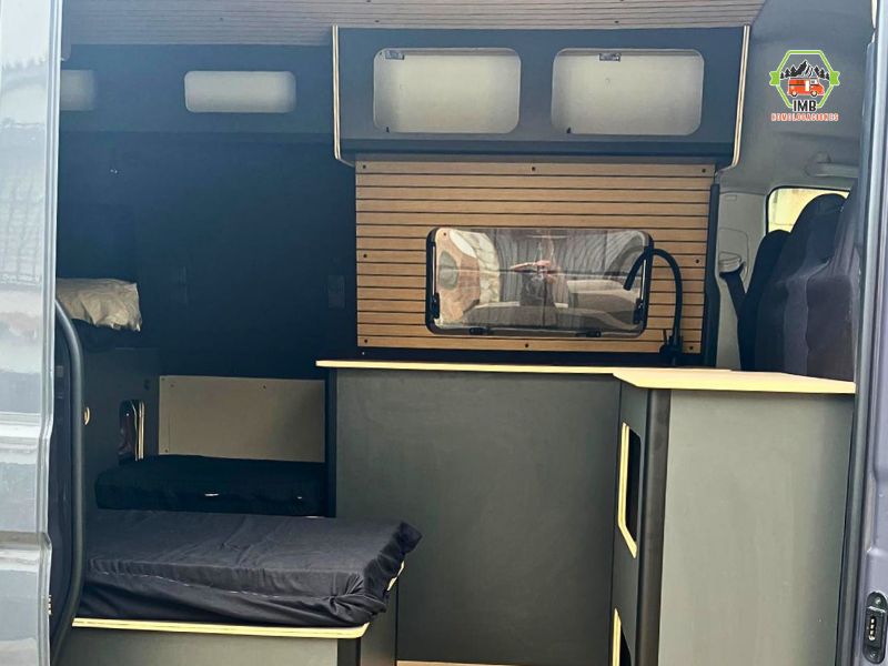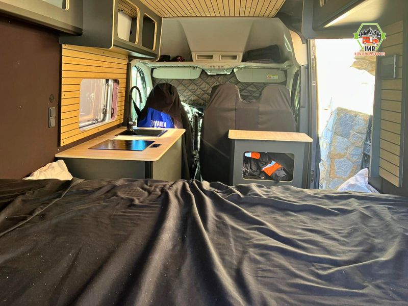 Aislamiento integral del habitáculo con KAIFLEX y revestimientos interiores en madera, junto con la instalación de mobiliario fijo a medida que configura las distintas zonas funcionales del vehículo.