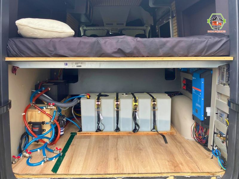 Legalización del sistema de agua compuesto por depósito de agua limpia de 150 litros y depósito de aguas grises de 80 litros, junto con bomba, vaso de expansión y toma de ducha trasera integrada en el vehículo.