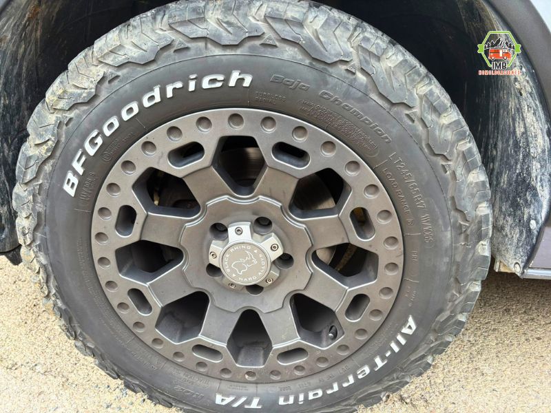 Sustitución del conjunto llanta-neumático por configuración de 17 pulgadas con neumáticos all-terrain, asegurando la compatibilidad técnica y dimensional.
