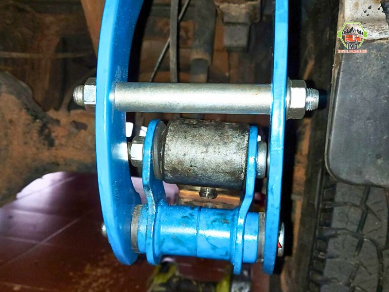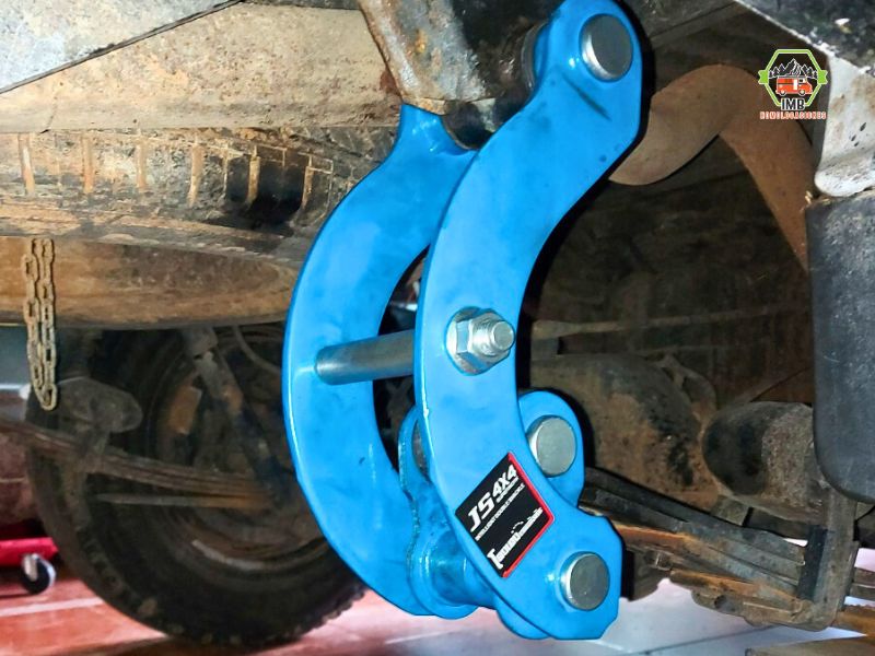 El conjunto incluye body lift delantero de 2,5” sobre el conjunto muelle/amortiguador y body lift trasero de 2” fijado a ballestas y carrocería en sus anclajes originales.