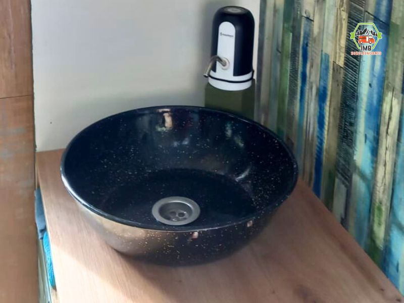El conjunto incluye sofá-cama, zona de cocina con encimera y fregadero, estanterías, baldas y elementos auxiliares de almacenaje, adaptando el espacio interior a un uso habitacional real.