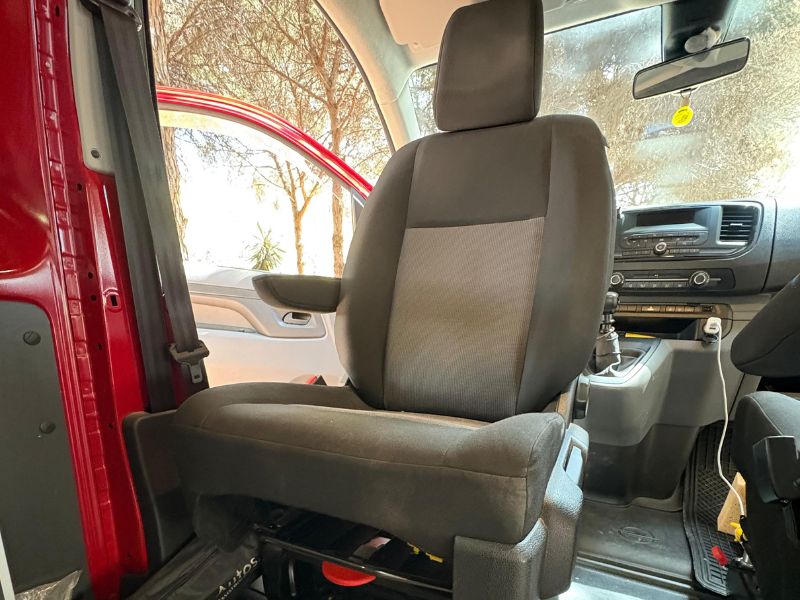 Se modifica el asiento del conductor mediante la instalación de una base giratoria CTA, permitiendo una mayor versatilidad y aprovechamiento del espacio interior.