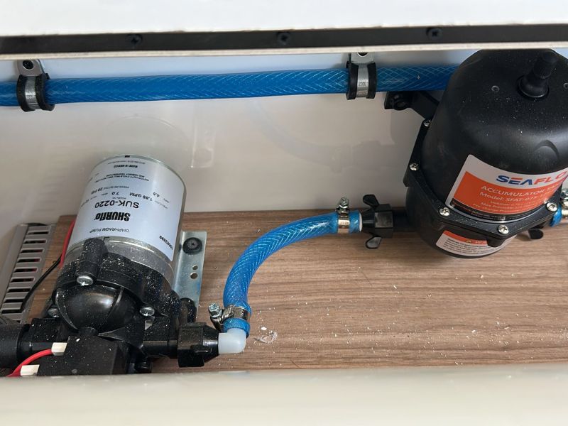 - Bomba de agua, vaso de expansión y toma de ducha exterior.
