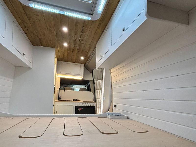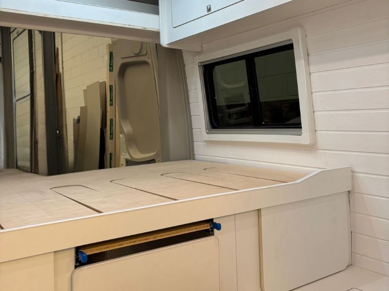 Aislamiento del interior con Kaiflex y revestido en madera, incorporando suelo vinílico, friso de abeto y acabados de alta calidad que mejoran el confort térmico del habitáculo.