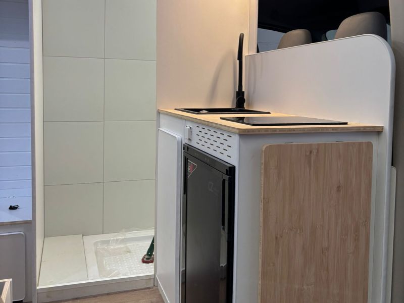 La distribución interior incluye muebles de contrachapado a medida: cocina con fregadero, nevera y hornilla, cama trasera con mesa extraíble, ducha interior, altillos y arcones laterales.