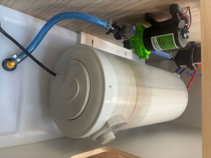 El sistema de agua cuenta con depósitos de limpias y grises, bomba de presión CZ, vaso de expansión SEAFLOW y toma de ducha interior.